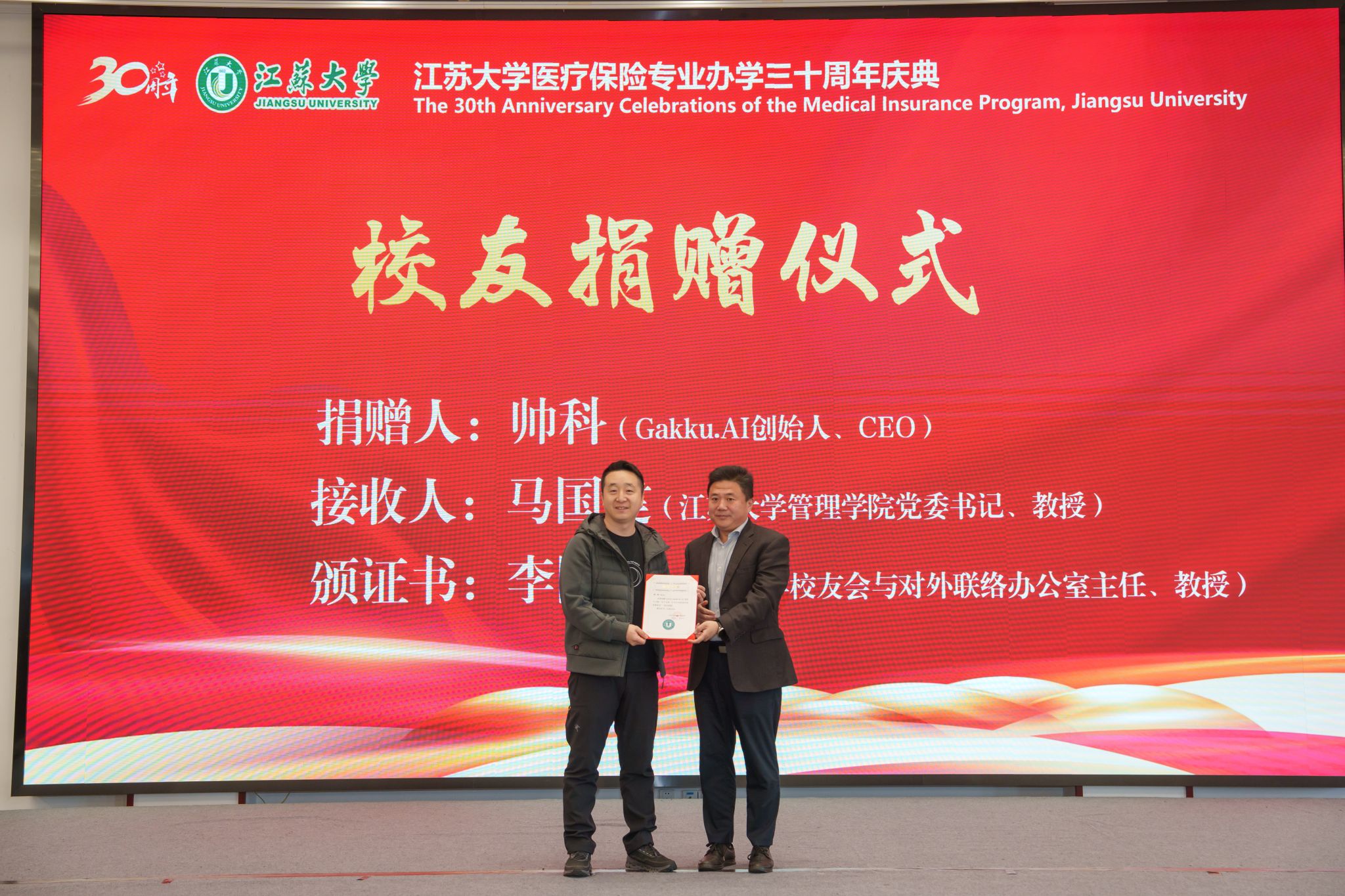 11月30日,在第八届 “三江” 医改论坛暨江苏大学医疗保险专业办学30周年庆典活动现场,我校医保2002级校友、猿辅导在线教育联合创始人、Gakku.AI创始人兼CEO帅科向江苏大学医疗保险专业慷慨捐赠30万元,专项用于支持学院人才培养与专业建设发展。